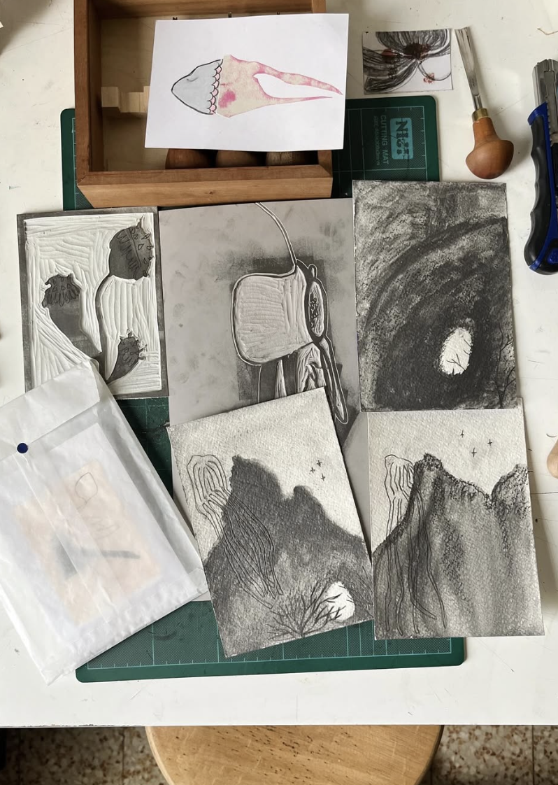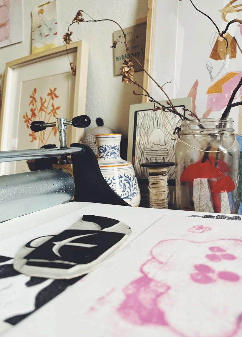 I’m an illustrator in love with printmaking, marks making and subtle colours. I love books of any kind, I get lost in picture books. My illustrations are often about plants, little animals and imaginary creatures. I would love to leave in a tree house, that’s probably why I often draw them. What really interests me is telling the story of the reletionship between us and nature.